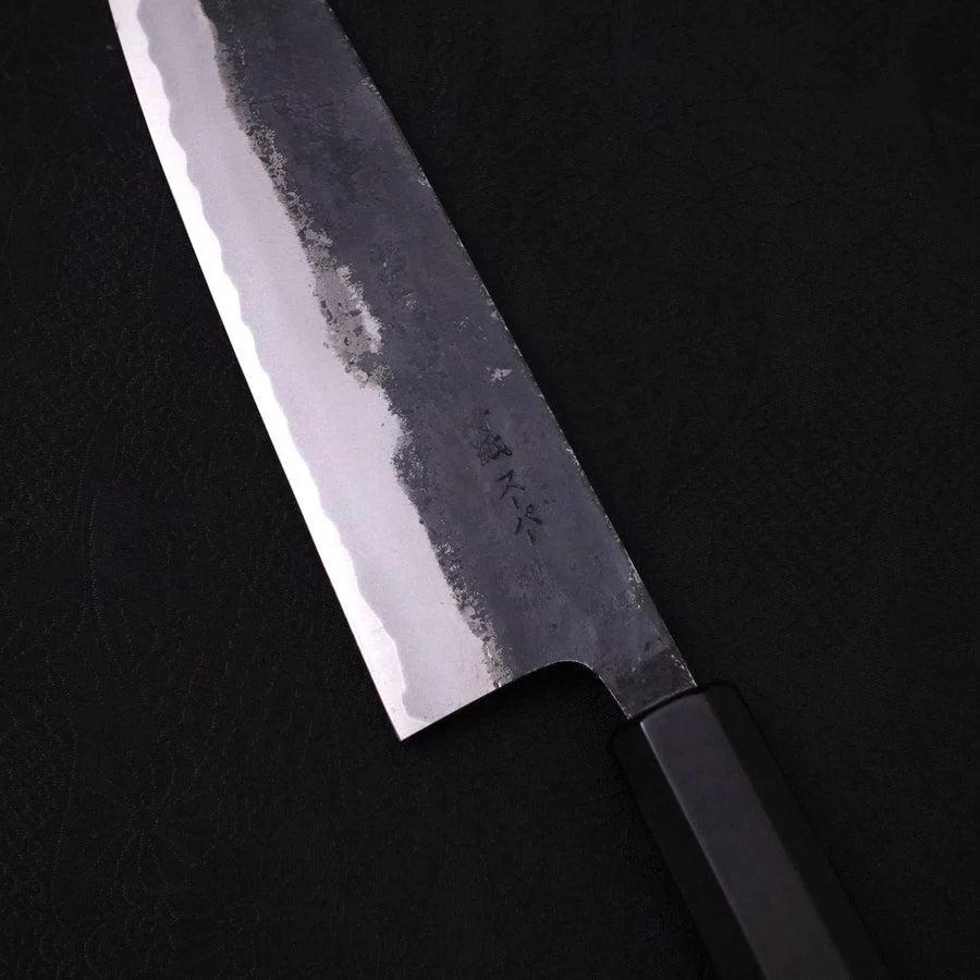 Dieses Gyuto ist aus Aogami-Super Kohlenstoffstahl geschmiedet und mit einem schwarzen Kurouchi-Finish versehen. Der luxuriöse Ebenholzgriff verleiht ihm eine edle Note. Professionelle Qualität und langanhaltende Schärfe machen dieses Messer ideal für den Heimgebrauch oder eine professionelle Küche. Genießen Sie überlegene Schneidleistung mit diesem stilvollen und langlebigen Küchenutensil!
